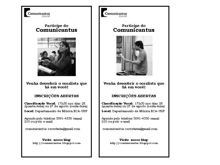 O Comunicantus estará com inscrições abertas até o dia 27 de agosto. Ainda há vagas para o Coral Oficina e o Coral Escola. As inscrições são abertas à toda comunidade e podem ser feitas pelo telefone 3091-4330, ramal 210, ou pelo email: comunicantus.secretaria@gmail.com. Os interessados deverão comparecer nos dias 25 (quarta-feira) ou 27 (sexta-feita) de agosto às 17h30 para classificação vocal. (Opcionalmente nos dias 18 ou 20, ainda esta semana, no horário dos ensaios).