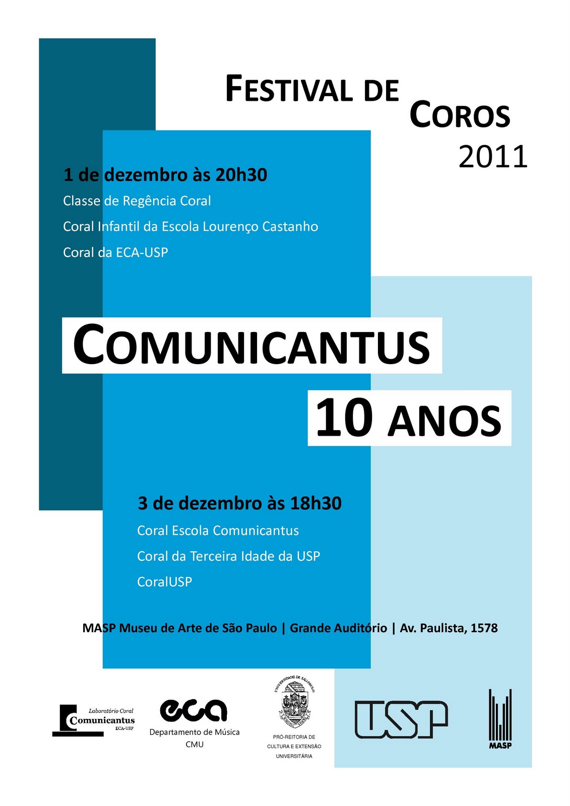 Além de 4 grupos do Comunicantus, o Festival traz dois coros convidados: o Coral da Escola Lourenço Castanho, regido por Marili Macruz, e o CoralUSP, regido por Márcia Hentschel. Pela primeira vez, o Festival Comunicantus trará um coro infantil, já anunciando um projeto ambiciosos para 2012: um seminário sobre canto coral com cursos e workshops sobre coro infantil.