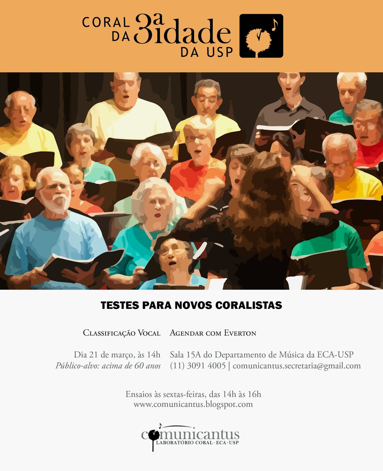 O Comunicantus: Laboratório Coral está com inscrições abertas para novos integrantes interessados em participar do Coral Escola Comunicantus ou do Coral da Terceira Idade da USP. Os testes acontecem nesta sexta-feira, dia 21 de março.