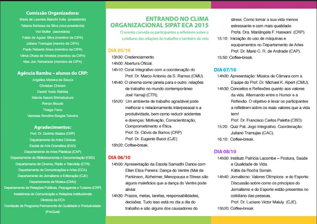 Dos dias 05 a 09 de outubro estudantes, funcionários e professores da Escola de Comunicações e Artes estão convidados a participar da Semana Interna de Prevenção de Acidentes de Trabalho (SIPAT), que se realizará no Teatro Laboratório da Escola de Artes Dramáticas (EAD). E já em sua abertura o Coral da ECA USP se apresentará sob a regência do prof. Marco Antonio da Silva Ramos, juntamente com o regente assistente Filipe Fonseca.