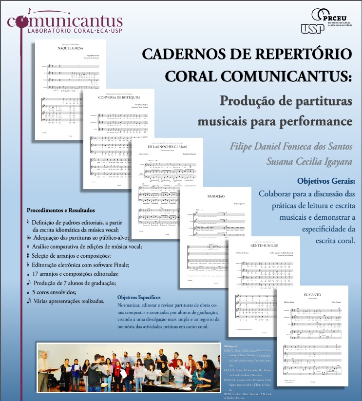O pôster de seu projeto de extensão, “Cadernos de Repertório Coral Comunicantus: produção de partituras corais para performance” será apresentado no dia A (10 de outubro) do congresso. A pesquisa, orientada por Susana Cecília Igayara, foi composta por análises de partituras corais compostas e arranjadas por alunos da graduação que permitiram uma discussão sobre as práticas de leitura e escrita de obras corais, visando nesse projeto também uma maior difusão dos trabalhos executados pelos alunos e apresentados em concertos.