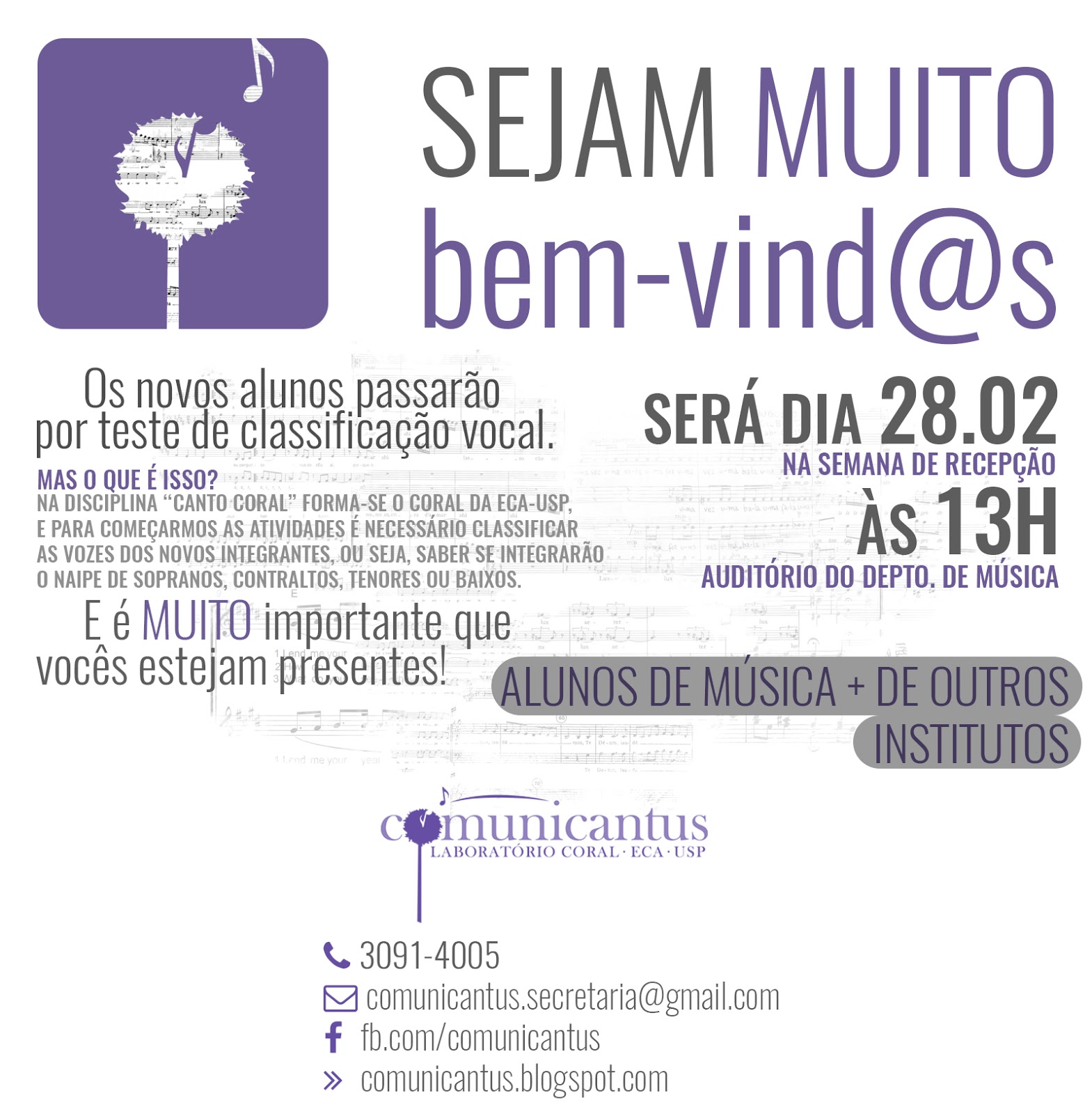 Os novos alunos matriculados na disciplina Canto Coral devem participar da classificação vocal que ocorrerá dia 28/02, como informado no cartaz abaixo.